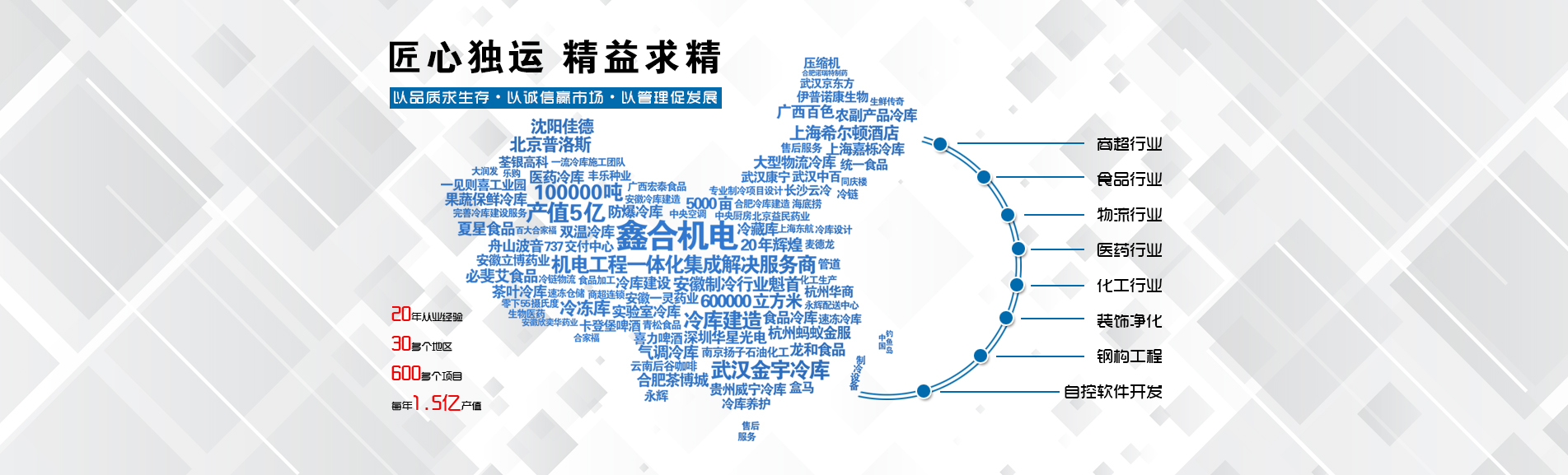 安徽鑫合機電設(shè)備有限公司于2002年組建運營,專業(yè)從事冷凍、冷藏庫、中央空調(diào)、醫(yī)藥凈化工程的規(guī)劃設(shè)計、施工承建、售后服務(wù)為一體的綜合性工程公司,與100多家實力雄厚的大中型企業(yè)建立長期產(chǎn)略合作關(guān)系,其中有多家世界500強和上市企業(yè)。公司作為中國倉儲與配送協(xié)會會員單位、安徽省制冷學會理事單位、上海楊浦區(qū)制冷協(xié)會工程總承包負責單位,引領(lǐng)于行業(yè)前沿。我們將銘記給予我們大力支持的各界新老朋友及合作伙伴,我們將會保持“互惠互利、共同發(fā)展”的原則與您共創(chuàng)雙嬴的合作關(guān)系。